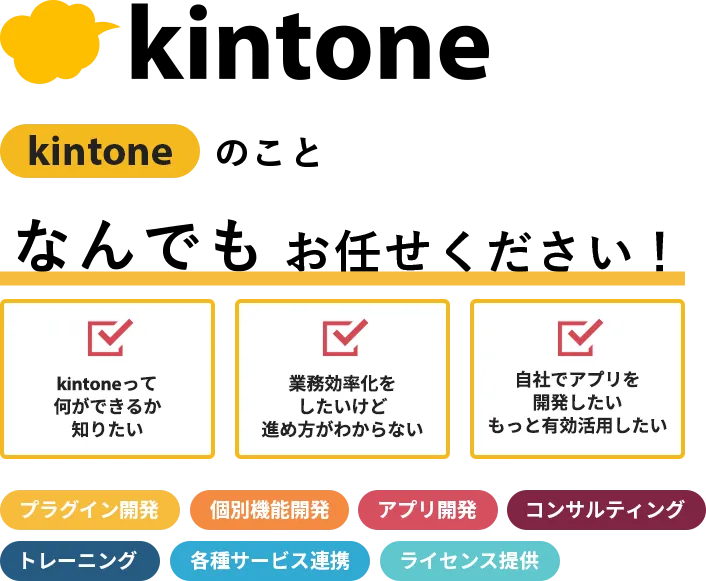 アプリの作成や機能を拡張するためのカスタマイズ開発、プラグインの提供はもちろん、kintoneおよび他関連サービスのライセンスの提供やトレーニングなどを提供します。導入検討フェーズから開発、運用までをワンストップでサポートします。